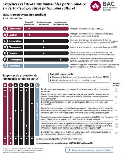 Le BAC offre aux intervenants en assurance et aux consommateurs des outils pour bien comprendre les différents statuts des bâtiments ayant un intérêt patrimonial. Un immeuble auquel une valeur patrimoniale a été attribuée mais qui n’a aucun statut visé par la Loi pourrait être assujetti à d’autres règlementations, comme par exemple un règlement municipal.